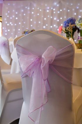Organza sashes are used as standard, although satin sashes are available at a small additional charge. These are available in a large range of colours, just let us know your colour scheme and we can match it as close as possible. We can cover 99% of different style chairs. Just let us know the venue and if possible a picture of the chair and we can confirm for you, some larger or unusual chairs may incur a small additional charge. Standard white chair cover with an organza sash from £3.50 - this includes delivery, set-up and collection in many locations. Call us now for a free chair cover hire quotation.