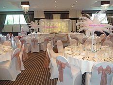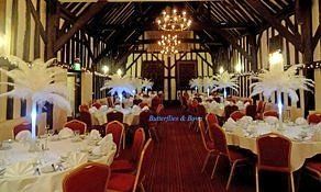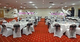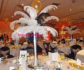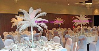 Prices from £35.00 for each ostrich feather centrepiece, which normally includes delivery and set up. Round table mirrors are normally set underneath them to give the full wow factor. For weddings, bridal bouquets with feather surrounds and top table flowers including feathers are also available and will complement these table centres.