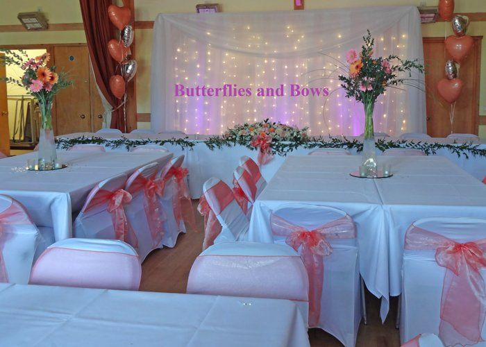 On this page you can view some examples of our latest full wedding styling set-ups, at venues across Surrey, Sussex and Kent, showing how we can create stunning venue designs to suit your wedding theme, providing floristry, balloons, chair cover hire, table centres, starlight backdrops and ostrich feathers.